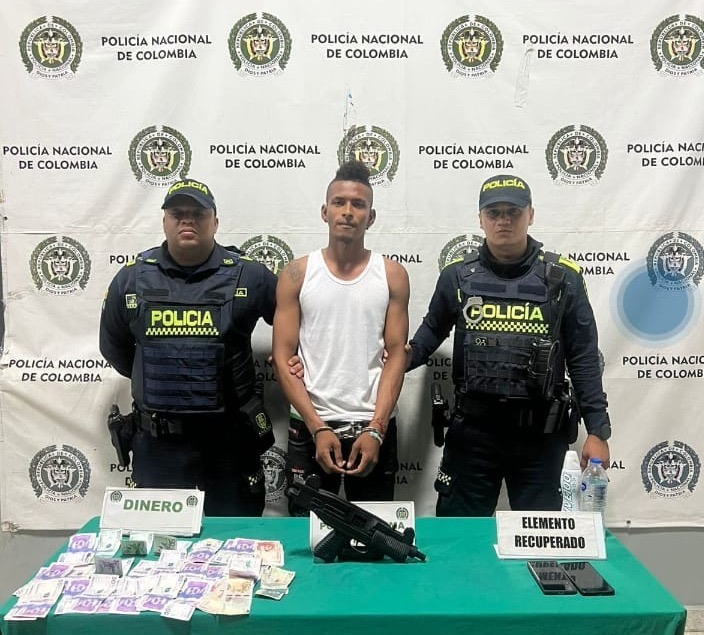 El sospechoso fue interceptado en la carrera 41 con calle 10, donde los uniformados procedieron a realizarle un registro personal. En su poder le hallaron una arma de fuego tipo Mini Uzi, de fabricación industrial y calibre 9 milímetros, junto con dos teléfonos celulares y dos millones de pesos en efectivo, dinero que, según las autoridades, sería producto del robo cometido minutos antes.