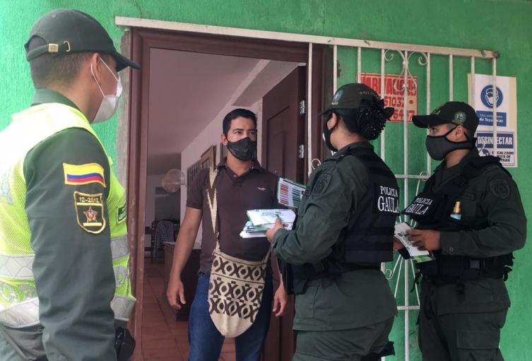 Los uniformados entregaron volantes con recomendaciones a la comunidad la importancia de seguir acatando responsablemente las medidas sanitarias dictadas tanto del gobierno nacional como departamental para continuar mitigando la propagación del coronavirus y a su vez disminuir el riesgo en los hogares, como también sean adoptadas las medidas de autoprotección y de seguridad para evitar ser víctima de cualquier delito.