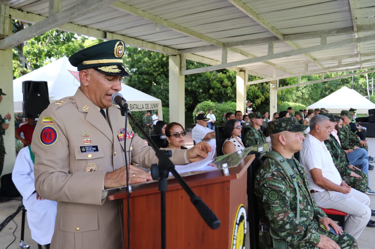 La ceremonia militar presidida por el mayor general Fabio Leonardo Caro Cancelado, comandante de la Séptima División, contó con la asistencia de autoridades civiles de Córdoba, Sucre y Antioquia, representantes de las diferentes instituciones de la Fuerza Pública, autoridades eclesiásticas, funcionarios de empresas locales, personal de la Reserva Activa y gremios.